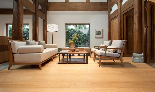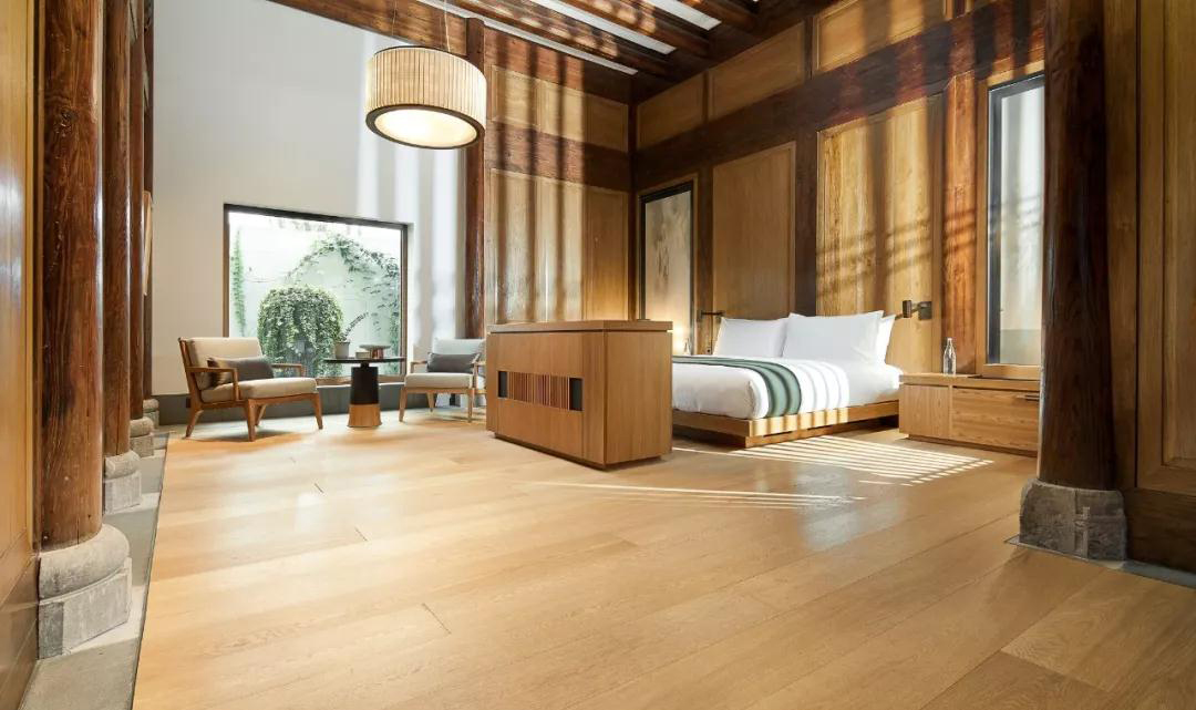 與古宅專注于古與新的和諧不同,現代客房完全是現代簡約的設計風格,讓顧客在香樟樹林環繞下悠享現代居住體驗,現代客房同樣鋪設書香門地定制款地板”一棵樹”系列。