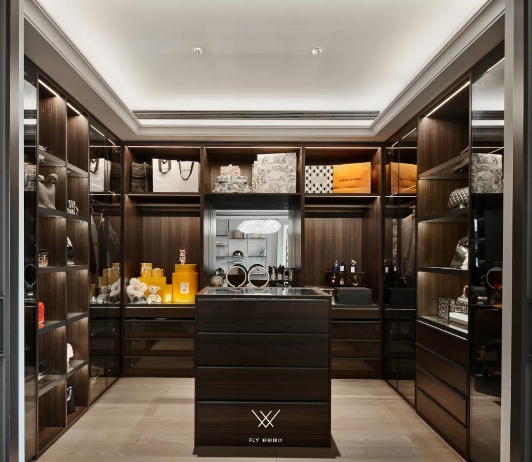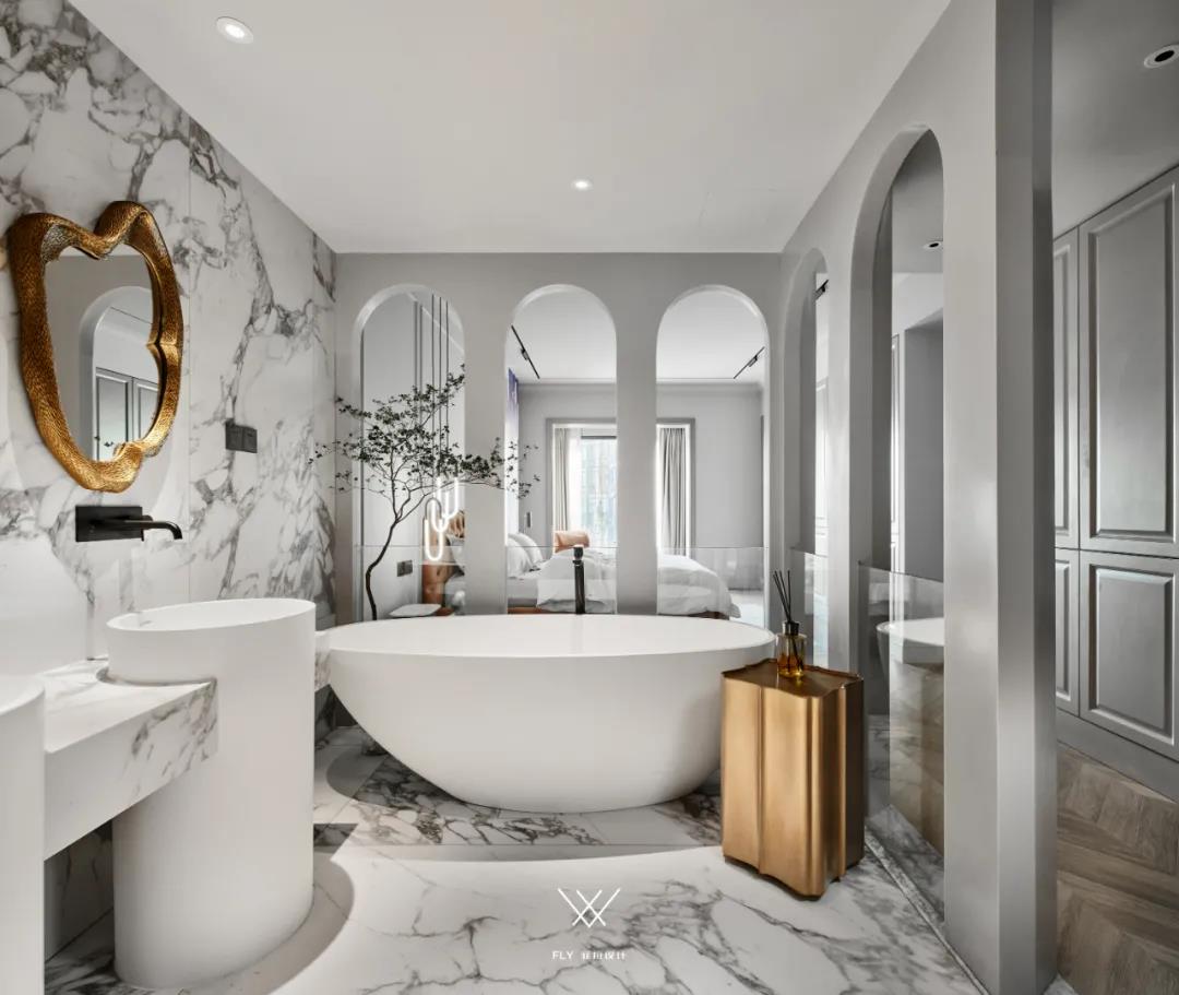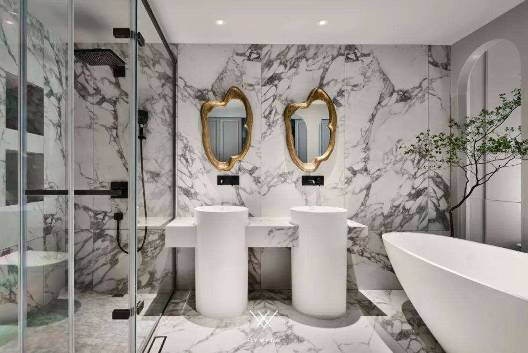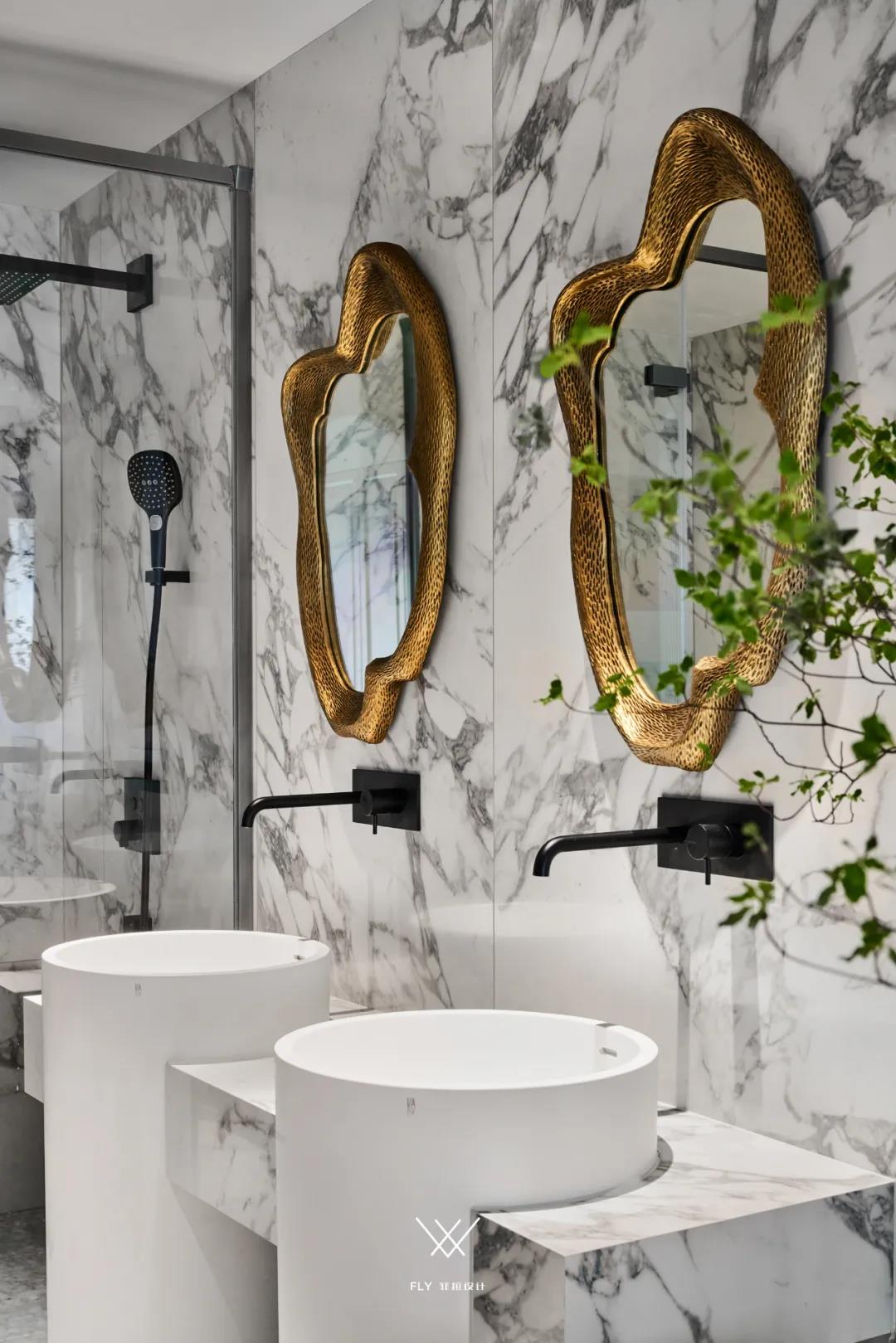 金色異形的洗漱鏡、雙臺盆設計,染墨狀紋理的大理石,營造精致優雅的輕松感。