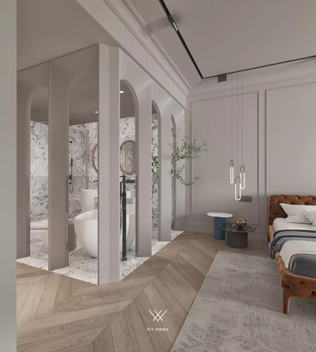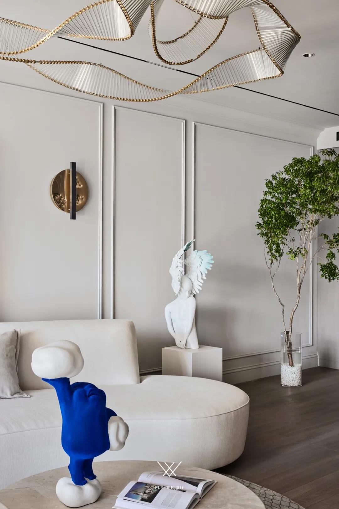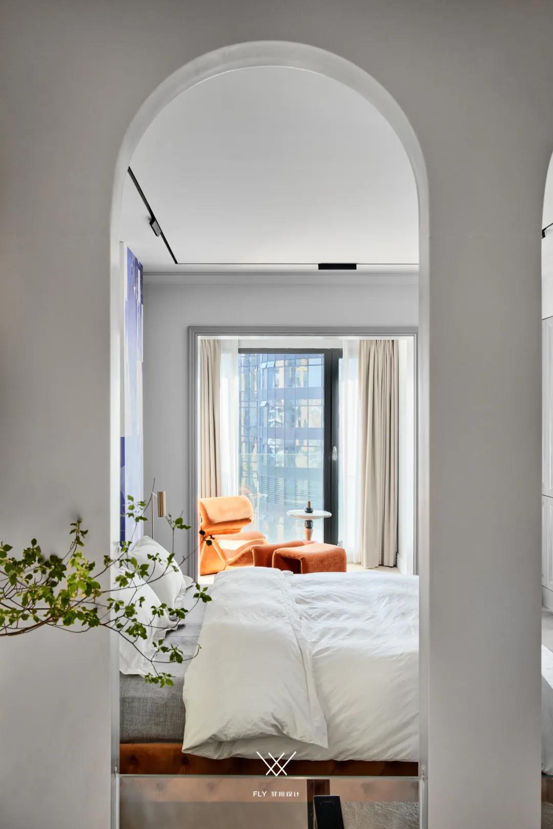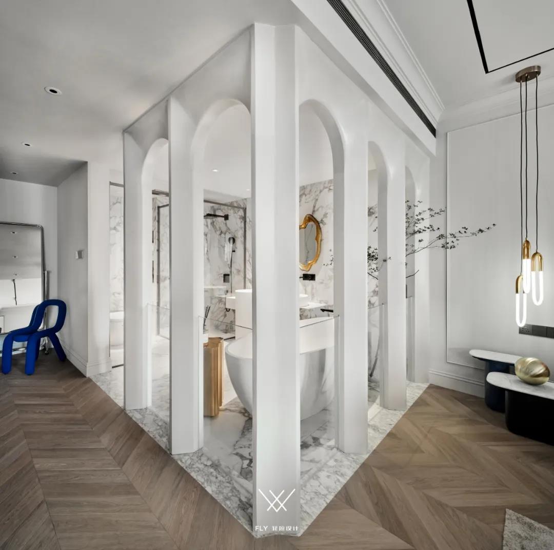 線條感吊燈,藍色落地畫使得整個空間層次更加豐富;雖隔卻連的衛生間從拱形門洞里探出的植物,恣意、叢生的呼吸感與靈動的浪漫延伸播散。