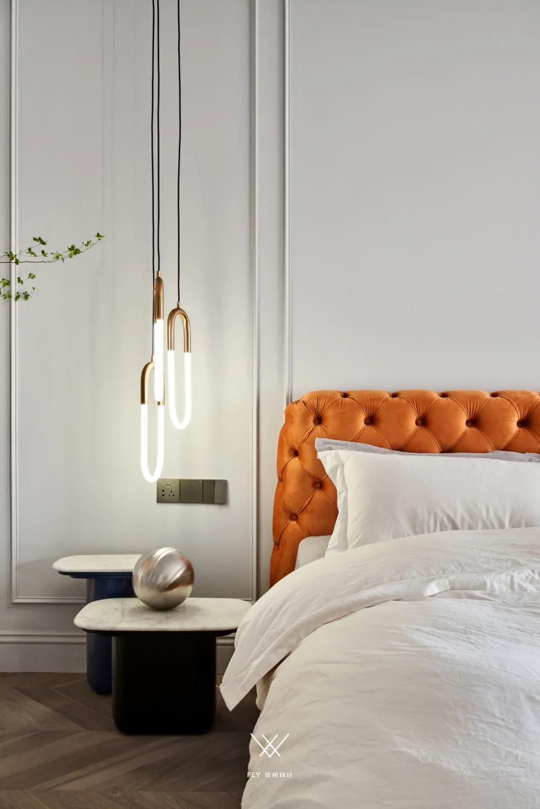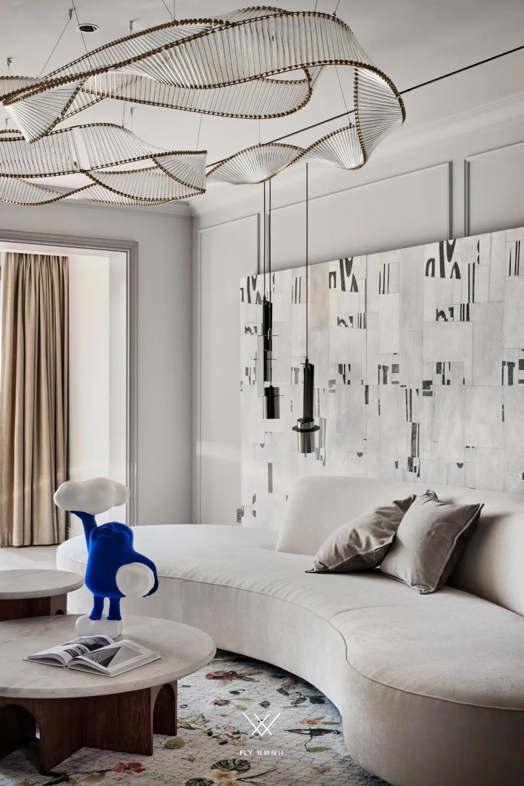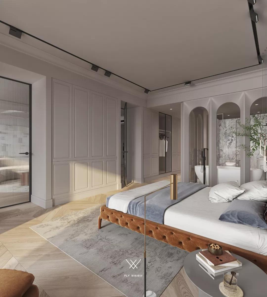 線條感吊燈,藍色落地畫使得整個空間層次更加豐富;雖隔卻連的衛生間從拱形門洞里探出的植物,恣意、叢生的呼吸感與靈動的浪漫延伸播散。