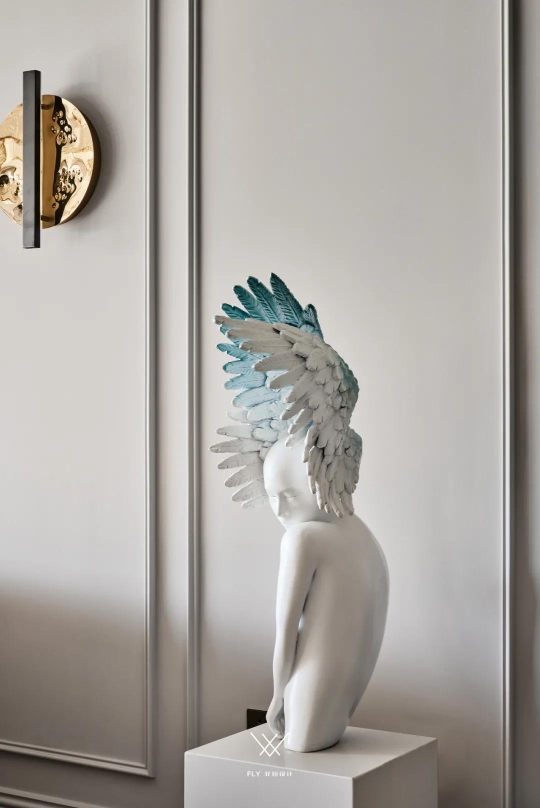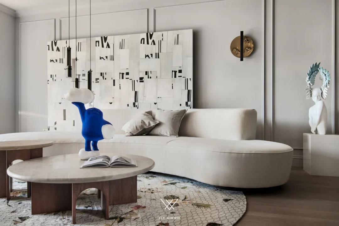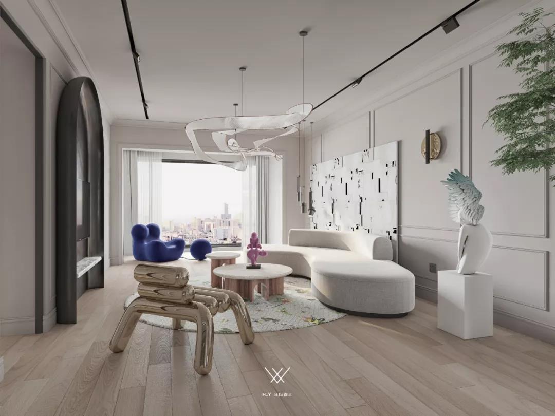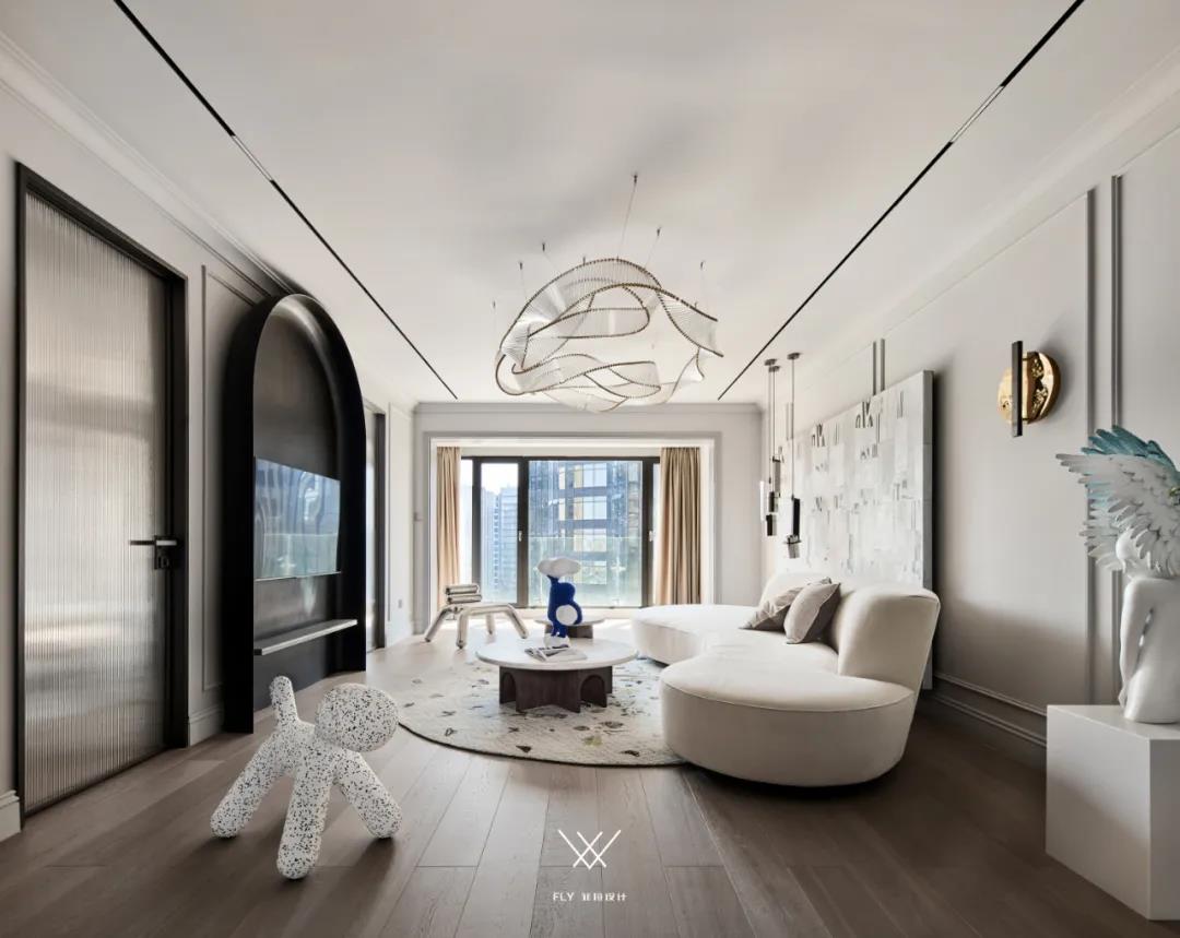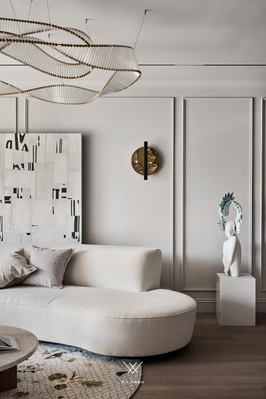 線條感吊燈,藍色落地畫使得整個空間層次更加豐富;雖隔卻連的衛生間從拱形門洞里探出的植物,恣意、叢生的呼吸感與靈動的浪漫延伸播散。