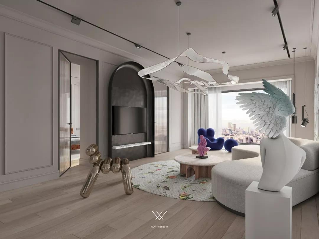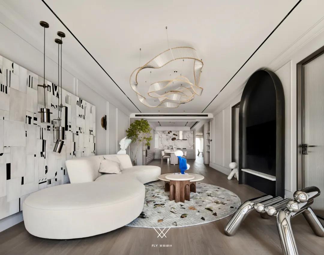 客廳注重后現代視覺效果,打破人們對常規家裝的刻板印象。設計師將建筑形式、園林景觀、公共藝術融為一體,大膽將古典跟時下潮流元素結合,打破時間與空間的維度釋放束縛。采用極富造型感的頂面裝飾,使客廳延展性更大,更有不緊不慢的自由感。