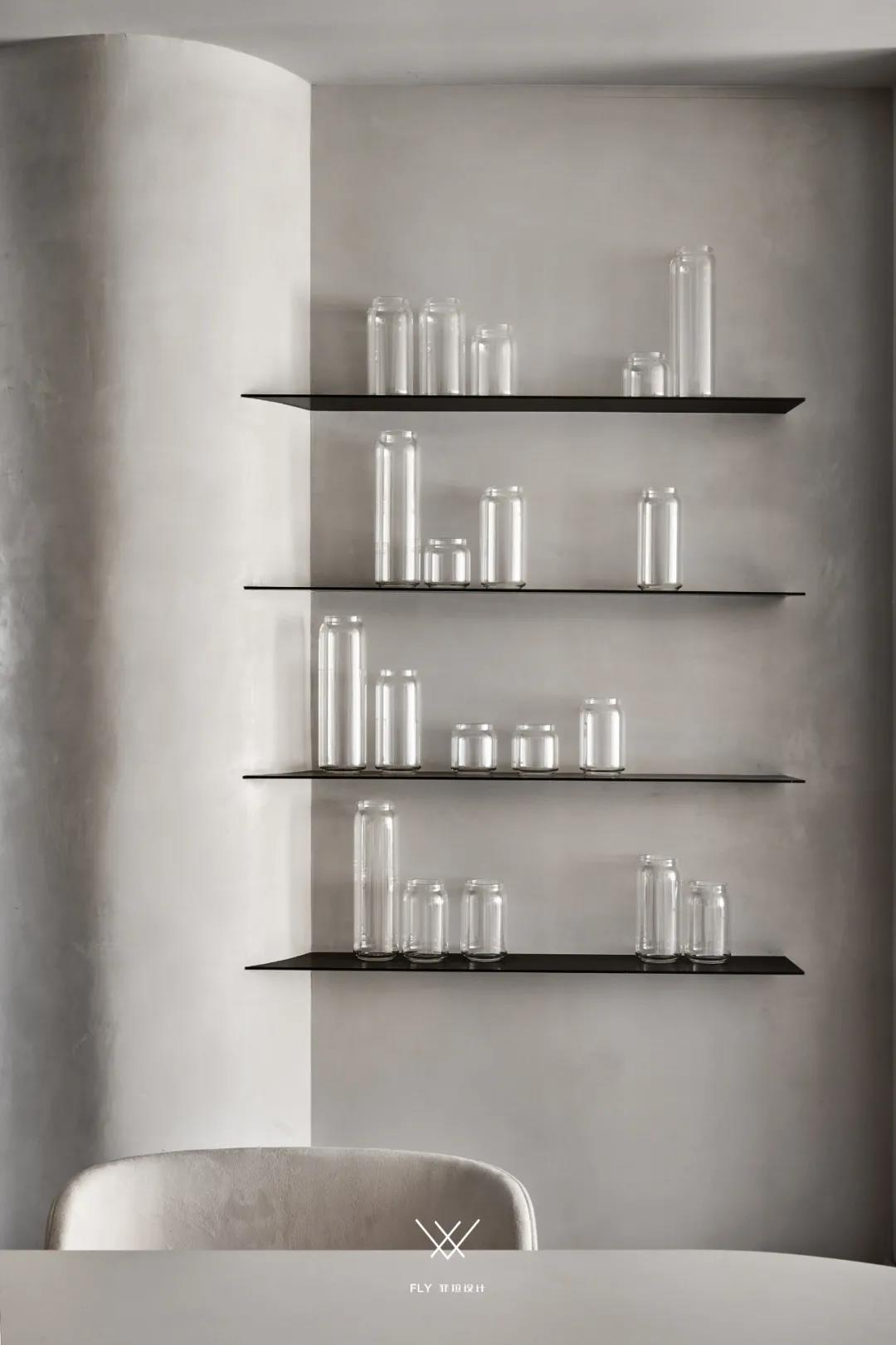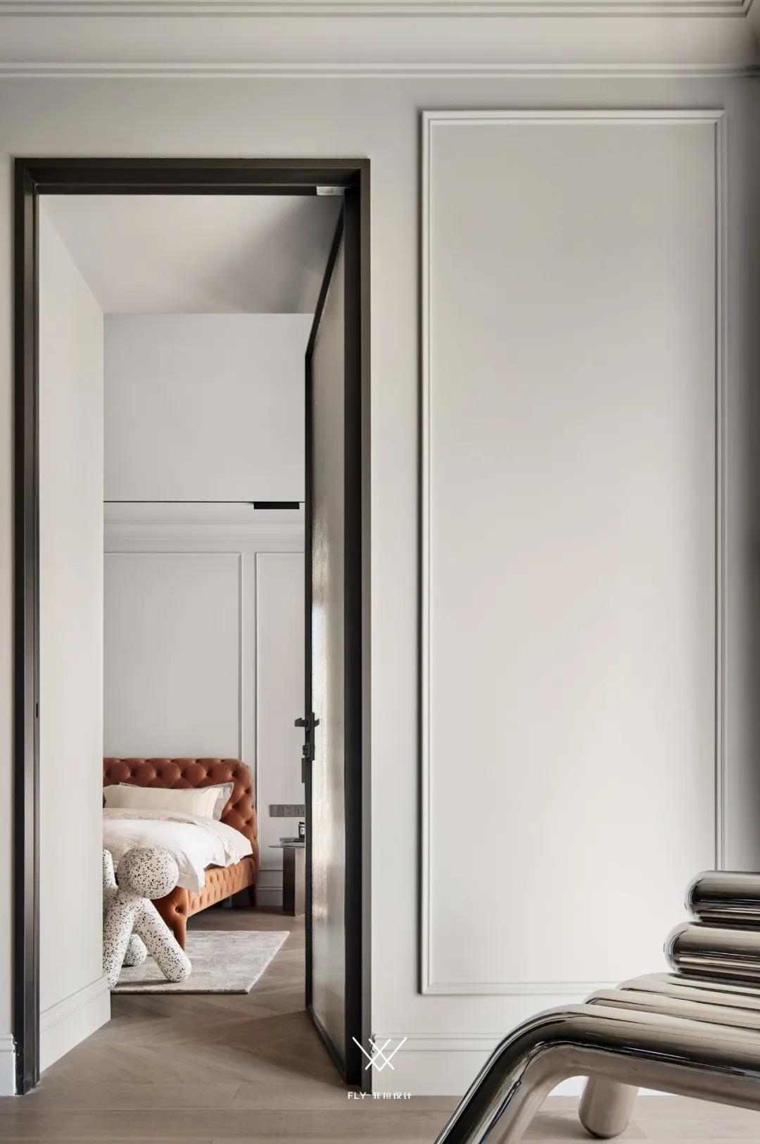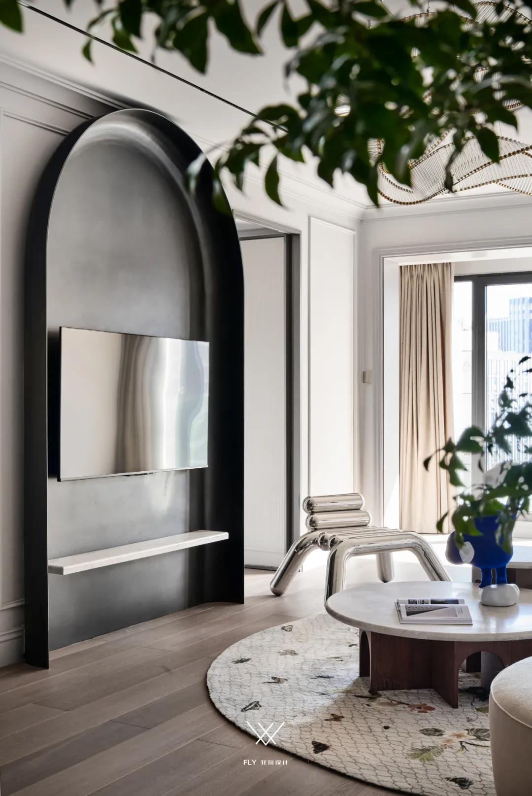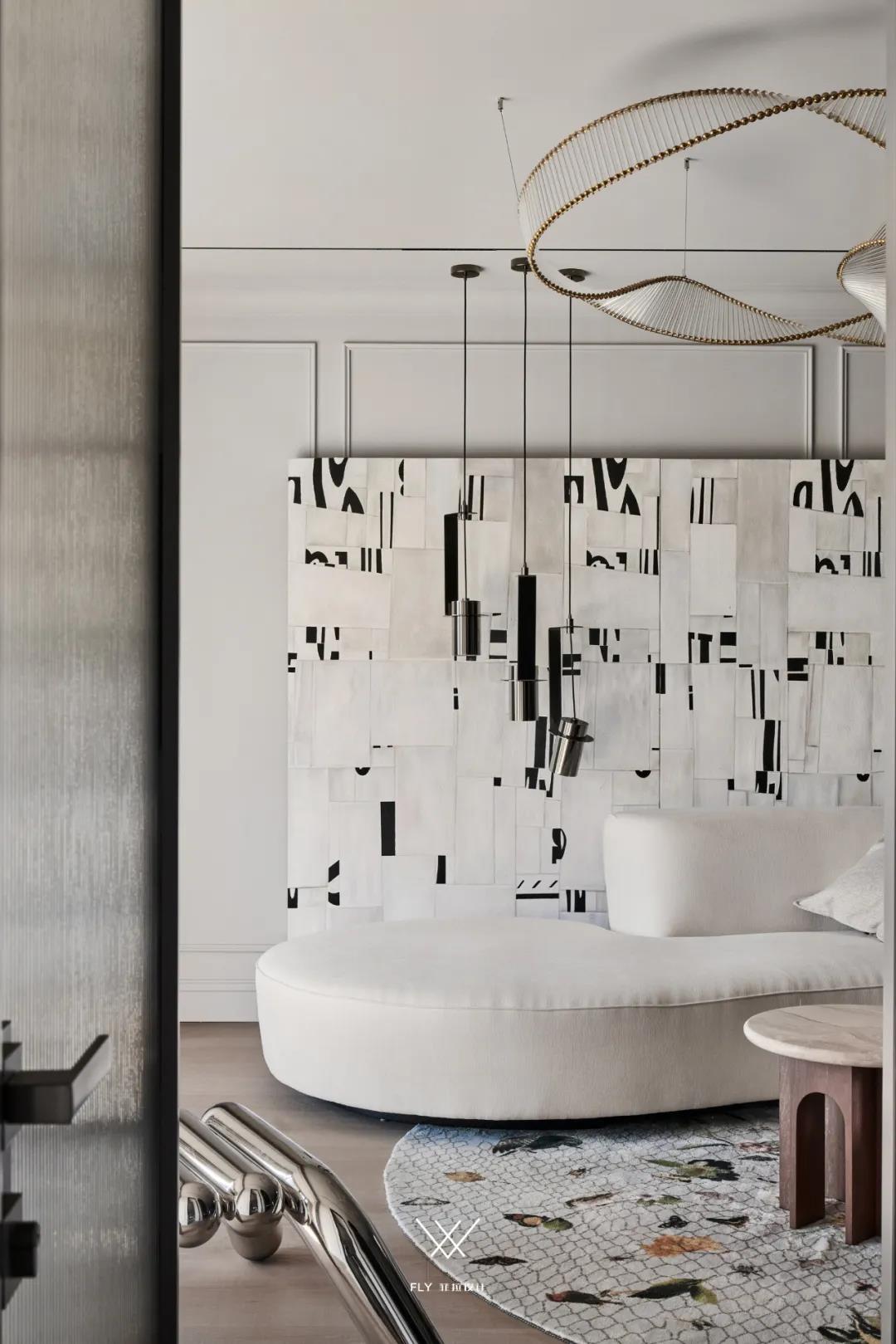 位于電視兩側雙門口的入臥通道打造空間儀式感,長虹玻璃本身的材質與紋理給予空間的通透屬性,也自然成為客廳的一處設計風景。