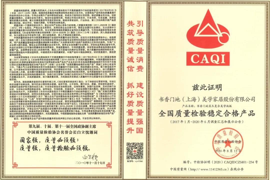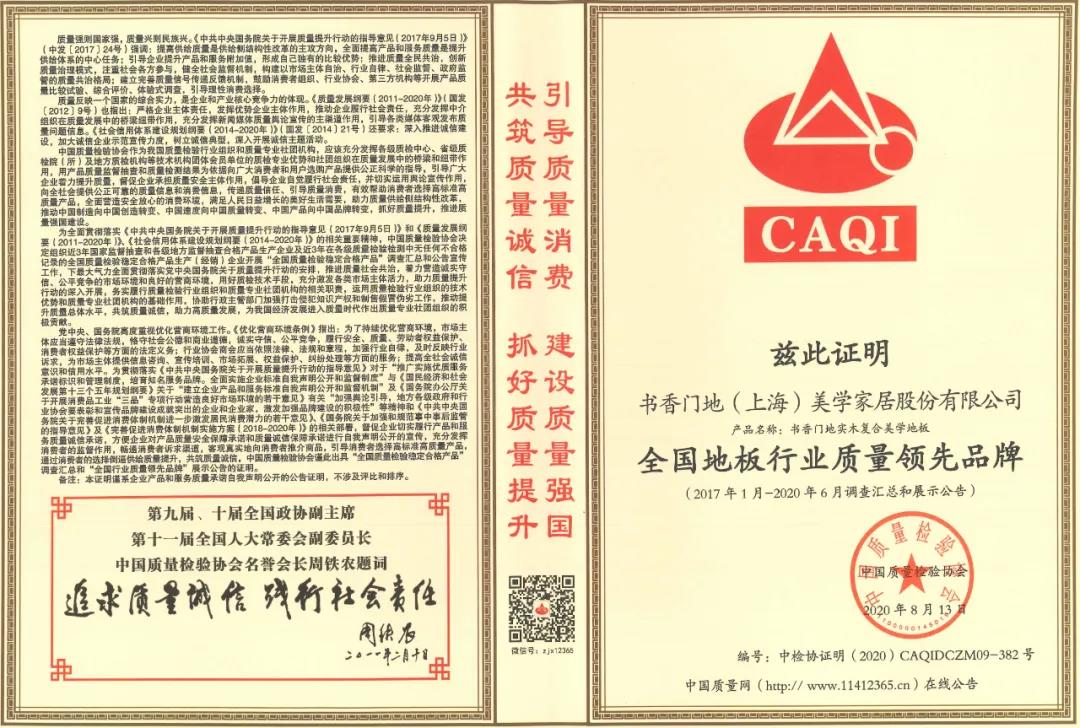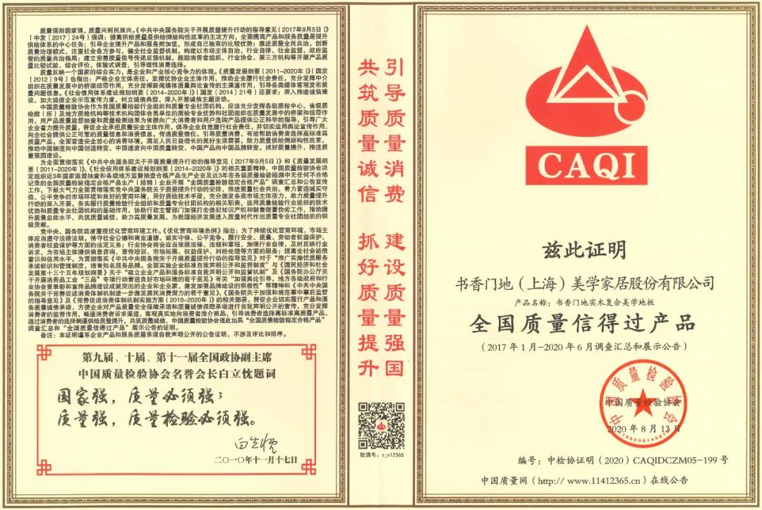 響應產品和服務質量誠信承諾,書香門地匠心品質獲社會認可,再次獲得中國質量檢驗協會頒發的「全國地板行業質量領先品牌」、「全國質量檢驗穩定合格產品」以及「全國質量信得過產品」的榮譽。書香門地積極傳遞質量信任,引導質量消費,抓好質量提升,助推高質量發展。