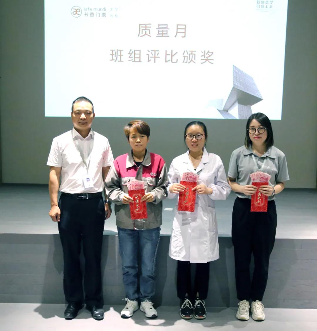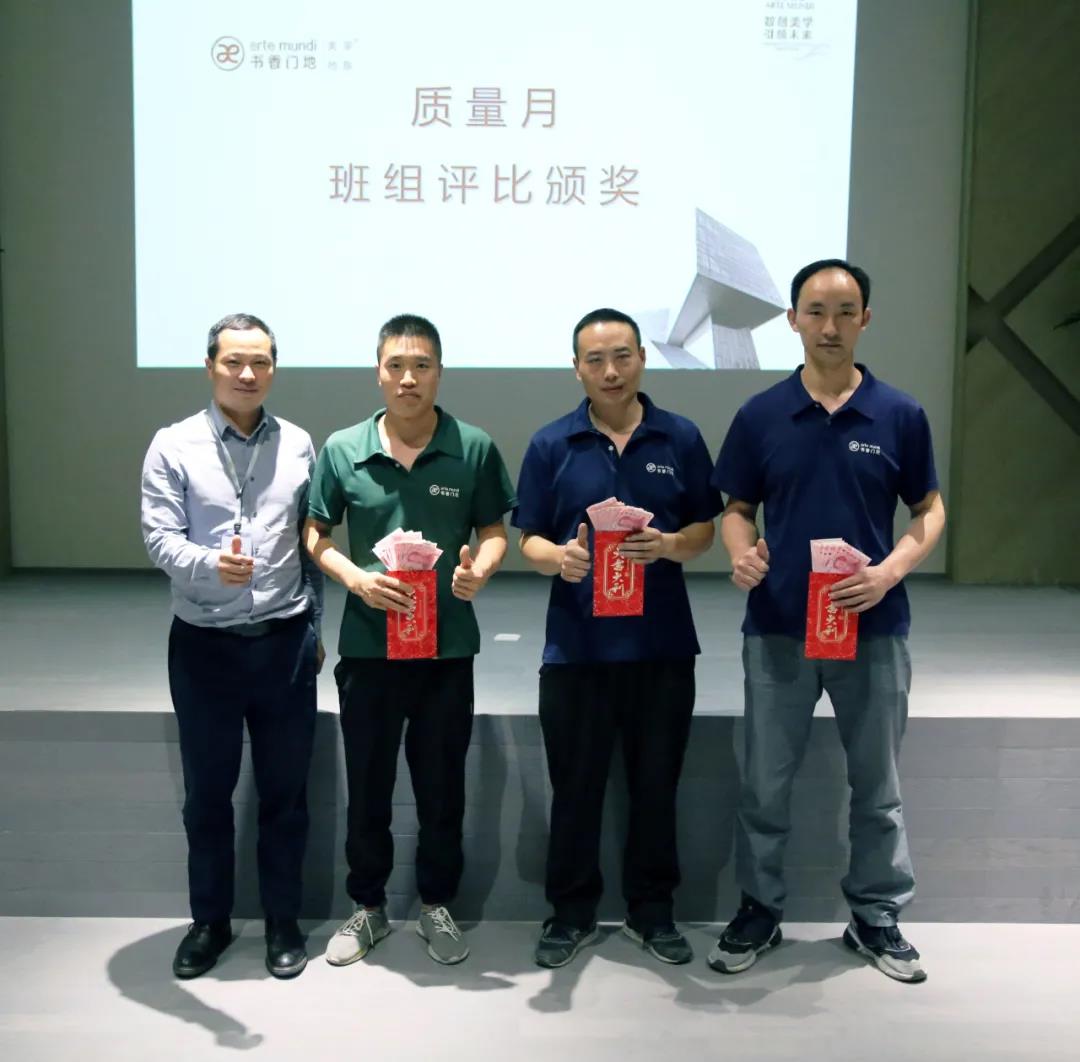 質(zhì)量部收集了為期一個(gè)月的「班組質(zhì)量大比拼」數(shù)據(jù),從各班組出材率、生產(chǎn)過(guò)程中質(zhì)檢員的抽檢合格率、參與質(zhì)量月活動(dòng)的積極性、提交相關(guān)數(shù)據(jù)信息的及時(shí)性等方面進(jìn)行評(píng)比,其中企口車間、涂飾車間及包裝車間各一個(gè)班組的評(píng)比成績(jī)達(dá)到卓越,予以現(xiàn)金獎(jiǎng)勵(lì)。
