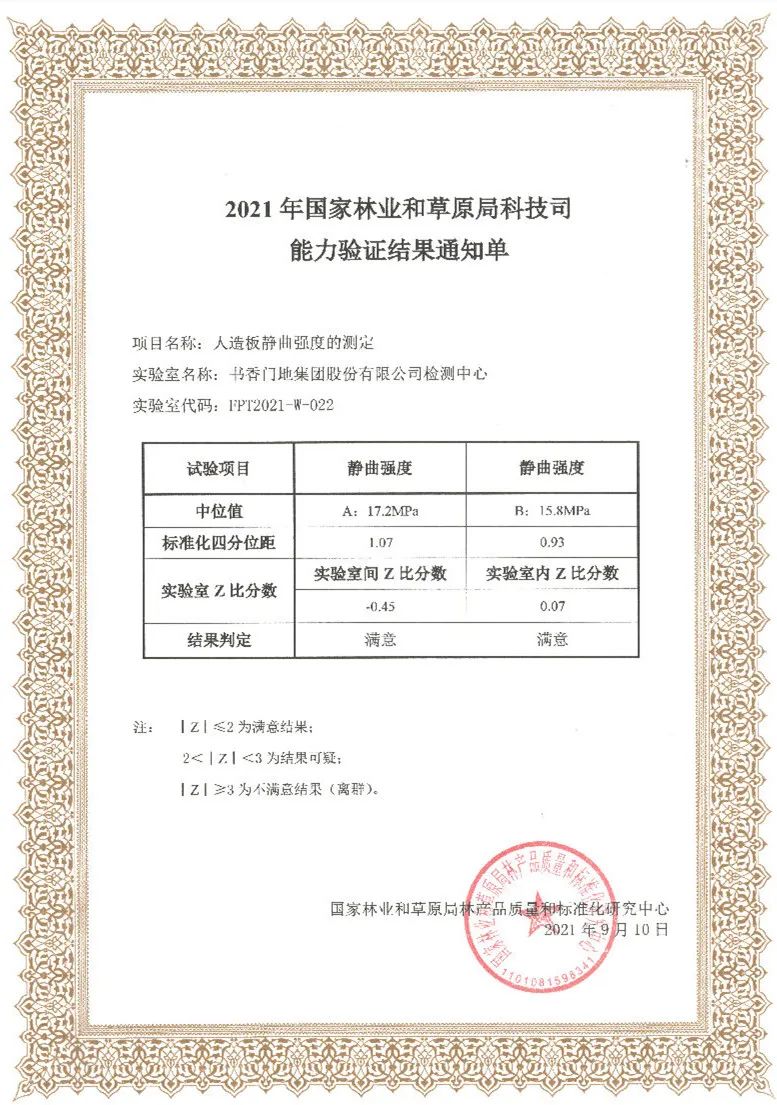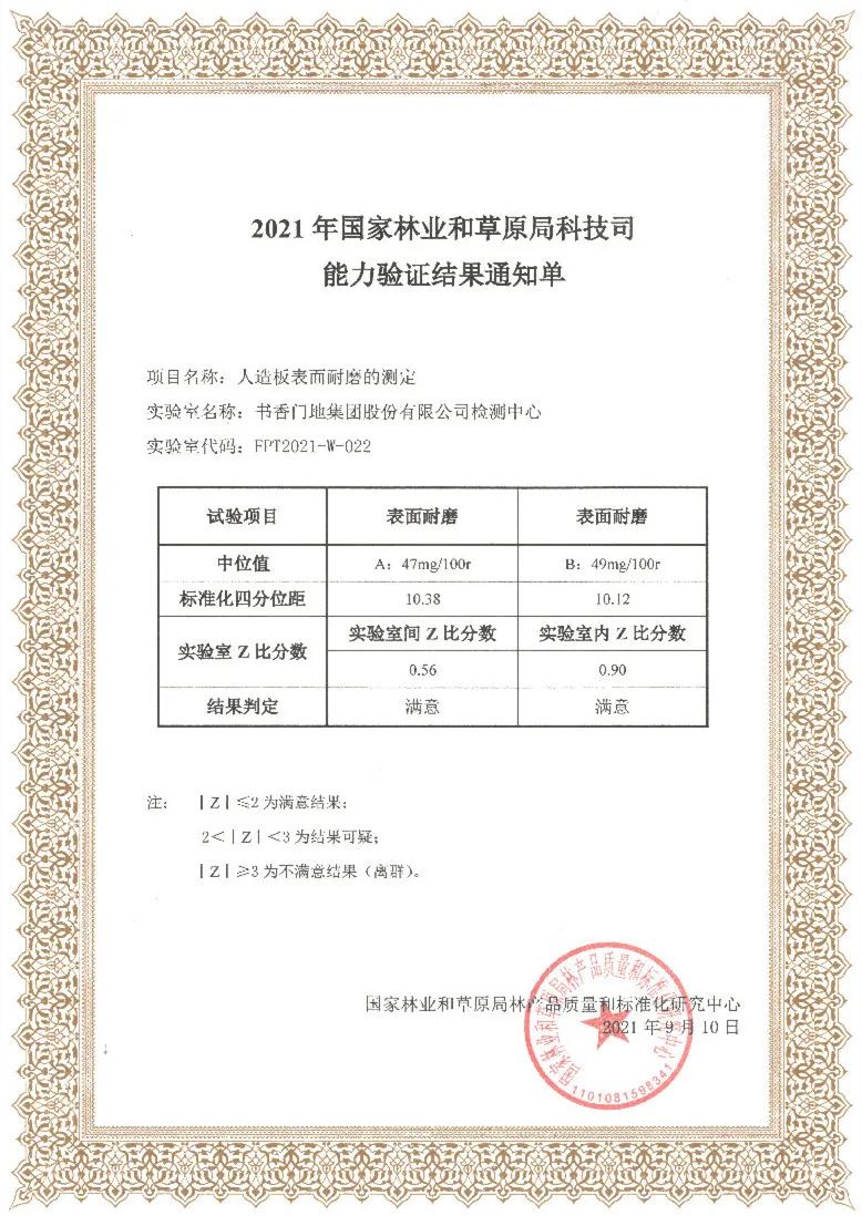 書香門地集團檢測中心參加由國家林業和草原局林產品質量和標準化研究中心組織的、國家人造板與木竹制品質量監督檢驗中心承辦的人造板表面耐磨、甲醛釋放量和靜曲強度3項檢測項目的能力驗證,均獲得滿意結果。