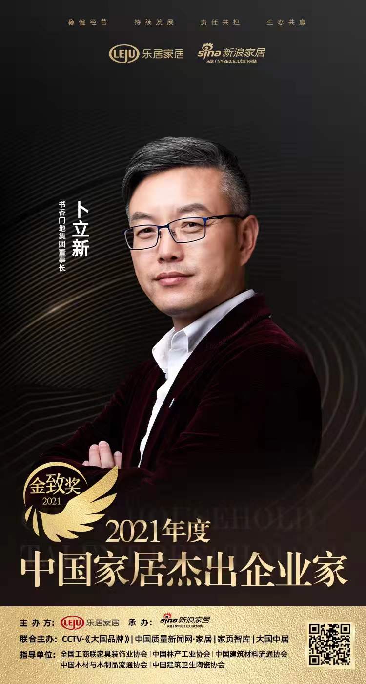 12月18日,由樂(lè)居家居、新浪家居主辦,CCTV《大國(guó)品牌》、中國(guó)質(zhì)量新聞網(wǎng)、中國(guó)林產(chǎn)工業(yè)協(xié)會(huì)、中國(guó)建筑材料流通協(xié)會(huì)、廣東省家居業(yè)聯(lián)合會(huì)等共同指導(dǎo)的“智見(jiàn)——2021中國(guó)家居新時(shí)代盛典暨金致獎(jiǎng)?lì)C獎(jiǎng)典禮”在廣東佛山盛大舉行。盛典現(xiàn)場(chǎng),書(shū)香門(mén)地集團(tuán)斬獲三大榮譽(yù)獎(jiǎng)項(xiàng),董事長(zhǎng)卜立新榮獲「2021中國(guó)家居杰出企業(yè)家」,副總裁顧環(huán)榮膺「2021中國(guó)家居品牌官100強(qiáng)」,書(shū)香門(mén)地美學(xué)地板榮獲「2021消費(fèi)者信賴十大地板品牌」