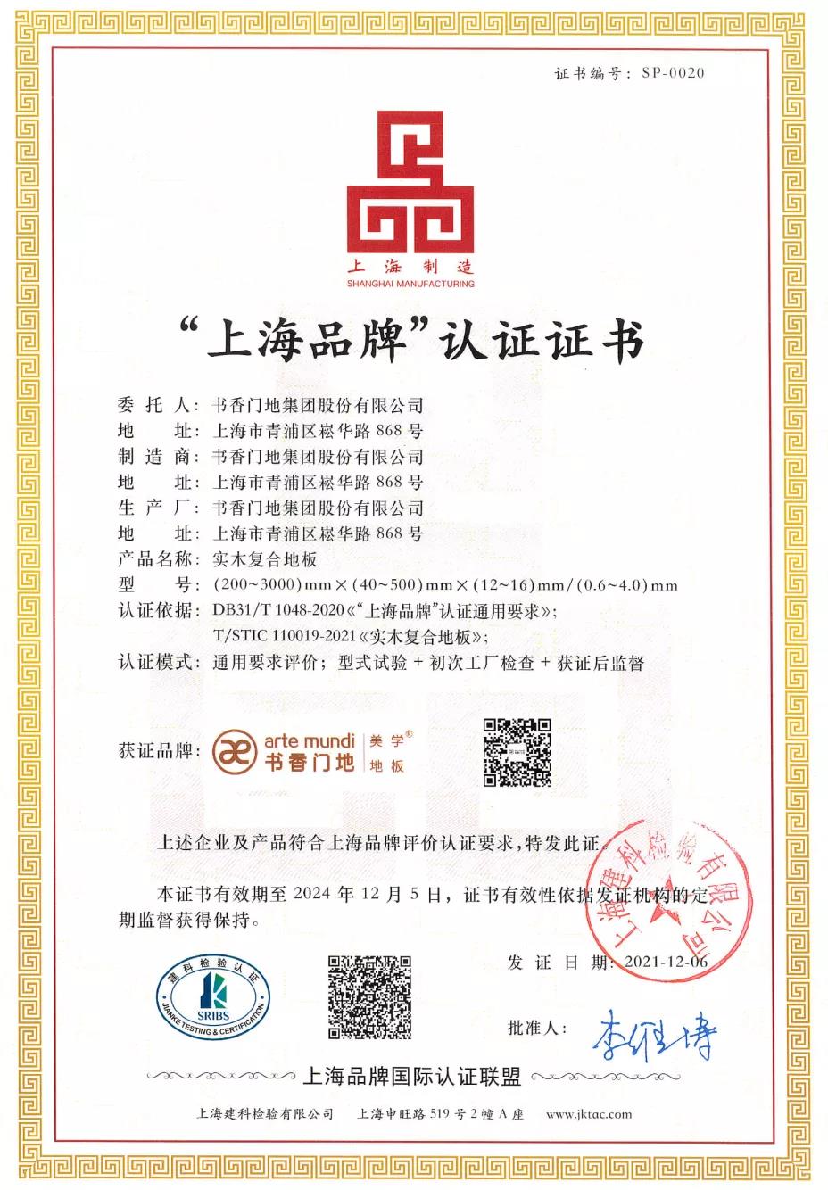 ▲ 書香門地“上海品牌”認(rèn)證證書