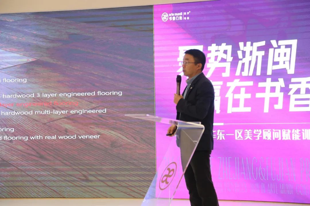 書香門地集團終端運營部副總經理周偉威從品牌力與美學力兩方面入手,向美學顧問們介紹書香門地悠遠的發展歷程,詳細講述書香門地美學設計觀念、產品研發故事、獨家匠心工藝、高端生產研發、質量檢驗工序與專業地板鋪裝方式。