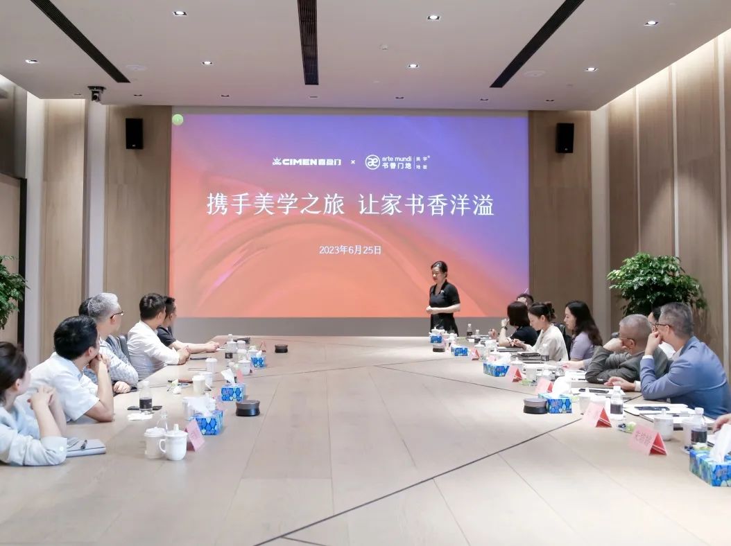 喜盈門集團執行總裁助理、運營中心總經理丁奕辰對書香門地的美學與藝術給予高度贊賞,美學理念、藝術雕塑、美學產品都給他留下深刻印象,同時向書香門地團隊展示喜盈門最新企業宣傳片并講解其創意概念。