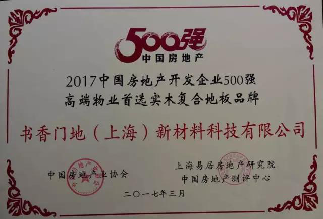 2017年3月22日,由中國房地產業(yè)協(xié)會和上海易居地產研究院中國房地產測評中心聯合舉辦的“2017年中國房地產500強測評成果發(fā)布會”在北京舉行。書香門地在此次發(fā)布會上成功斬獲“2017中國房地產開發(fā)企業(yè)500強-首選供應商·地板類”和“2017中國房地產開發(fā)企業(yè)500強-高端物業(yè)首選實木復合地板品牌”雙料首選品牌榮譽。