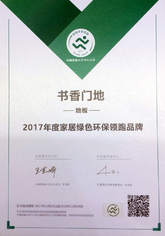 2017年12月20日,由紅星美凱龍聯合CQC(中國質量認證中心)公布2017年度紅星美凱龍推薦“家居綠色環保領跑品牌”榜單,書香門地榮登榜單。據了解,入選“家居綠色環保領跑品牌”榜單的企業通過極為嚴苛的評選標準,歷經工廠檢查,產品檢測,專家綜合評審等多個環節的嚴格篩選。卓越的質量管理是將嚴苛的品質管控體系與科學的質量管理理念和豐富的品質管理經驗相結合,此次獲“家居綠色環保領跑品牌”,是對書香門地質量管理體系的高度認可。