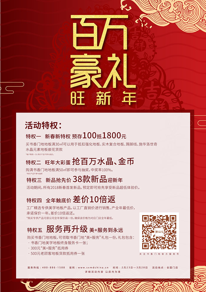 書香門地在2018年2月23日—3月20日推出“百萬壕禮旺新年”全國促銷活動(dòng)中,為廣大消費(fèi)者帶來旺宅、旺運(yùn)的新年大禮,就等你來搶!