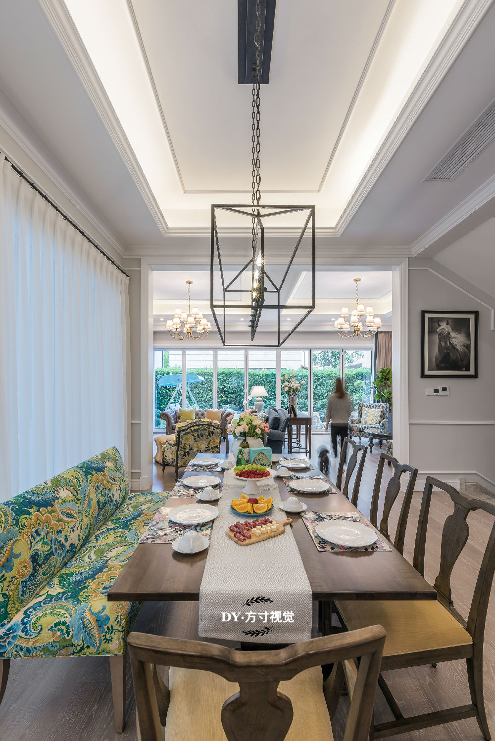 布藝紋沙發和具有中式風格的座椅搭配毫無違和感,餐桌頂端的藝術燈別具一格,整體搭配舒適又充滿現代感。