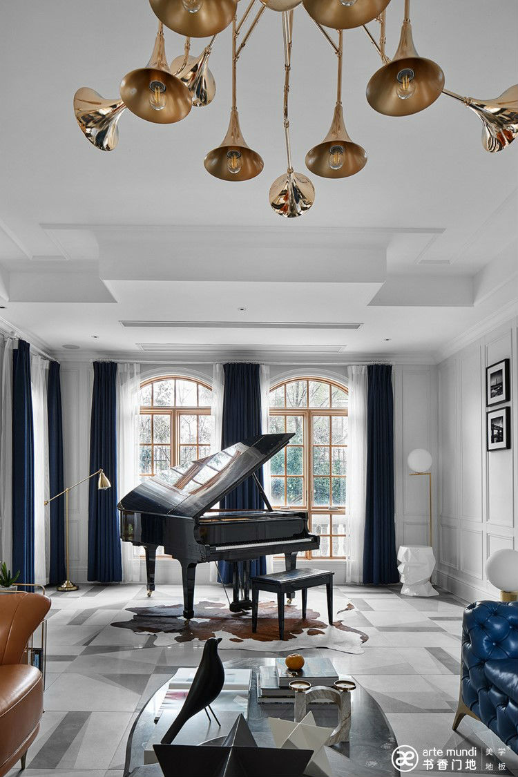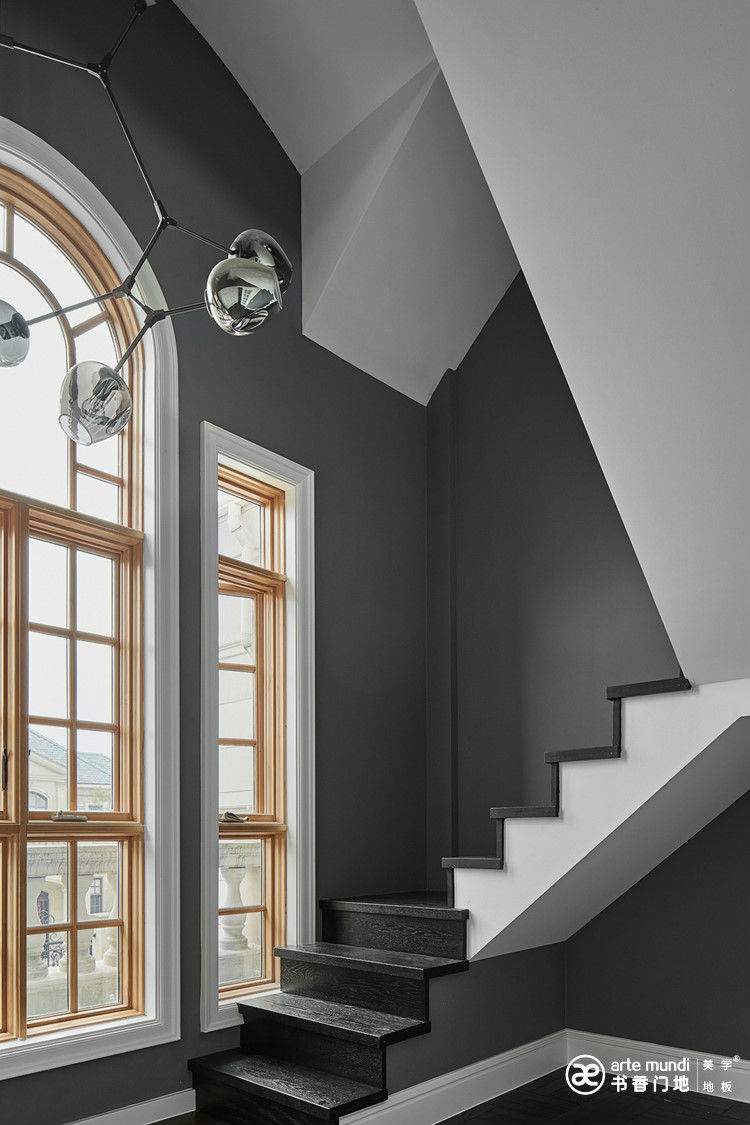 一層為客廳、餐廳和廚房,在黑白灰的整裝基礎上,用亮藍色和明橙色的冷暖色去強調色彩的延續性,轉角樓梯用書香門地-莫奈的河水系列地板,巧妙的搭配,大膽的撞色更是遵循了美學的原理讓整體空間更具有戲劇性。