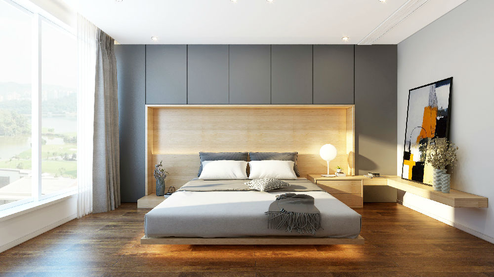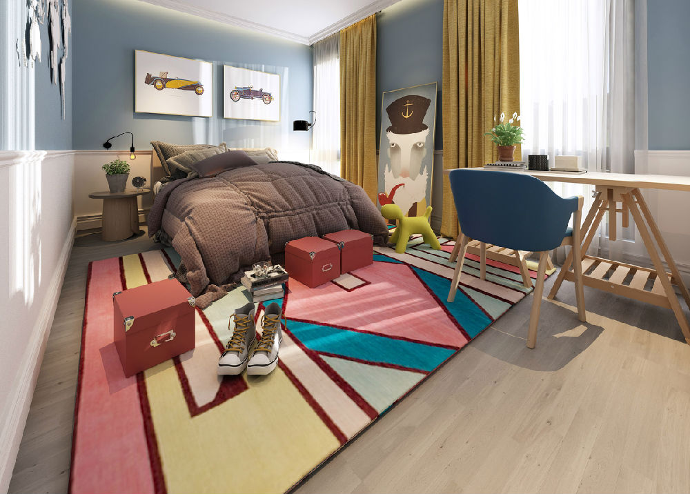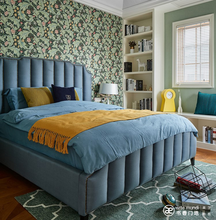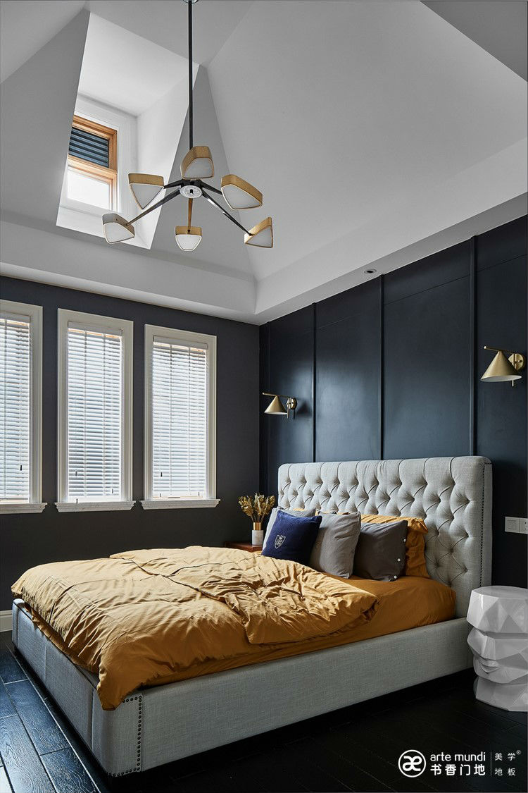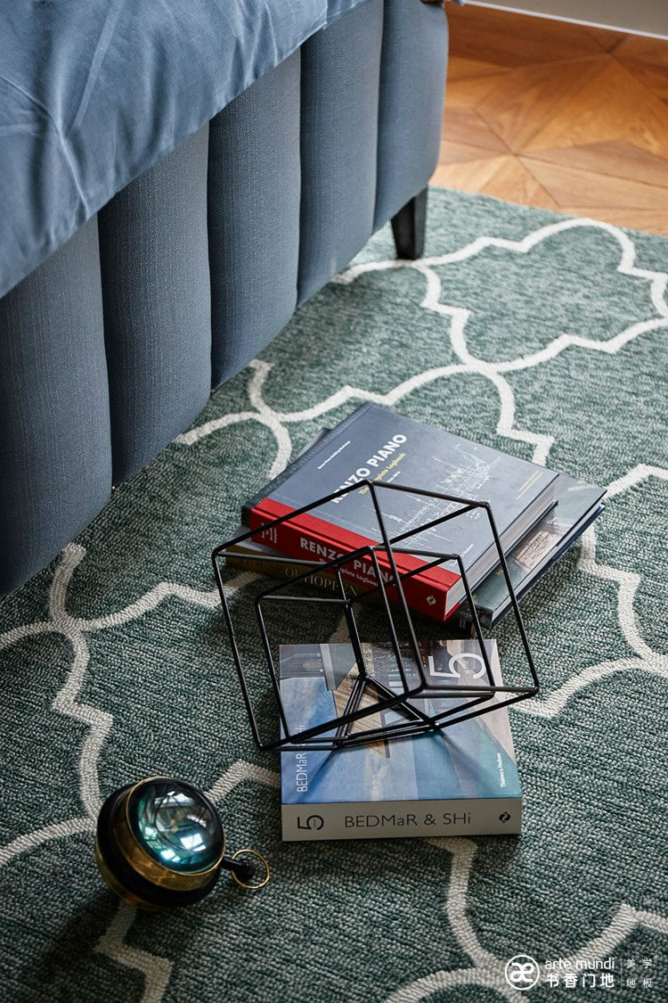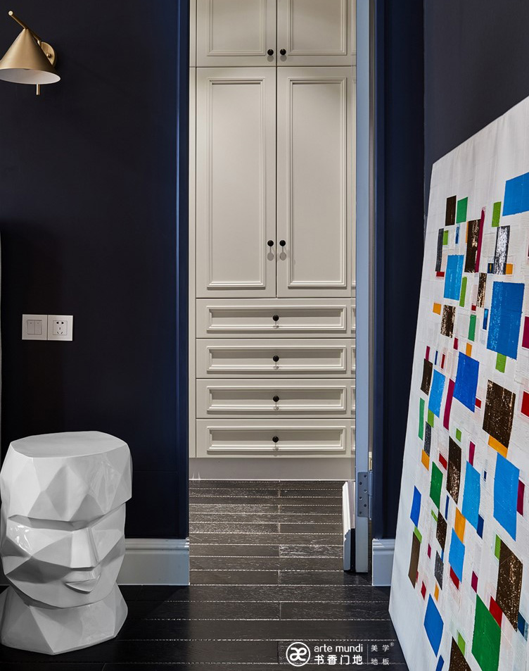 二層和三層分別為臥室、主臥及衣帽間,臥室的布局也在細節中體現不同的主題和表現手法,以藍色為主調的房間配書香門地ART-009藝術拼花地板,讓原木色去提升整體空間的自然感和暖意,印花墻紙和白色墻面更能體現整體空間的溫馨和舒適感。