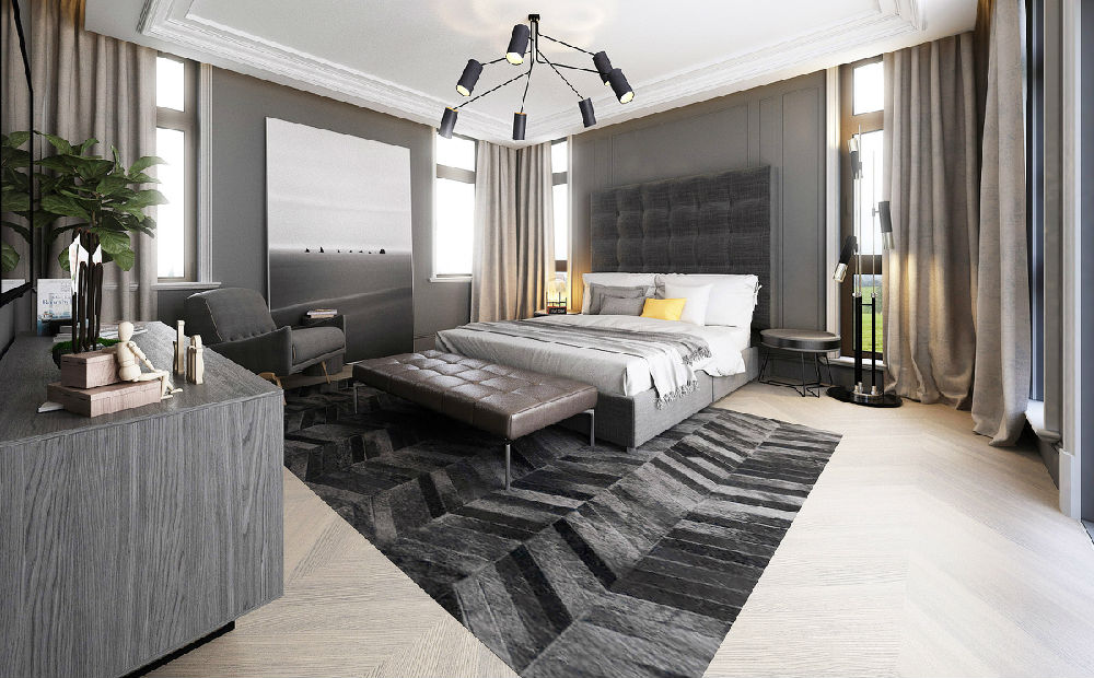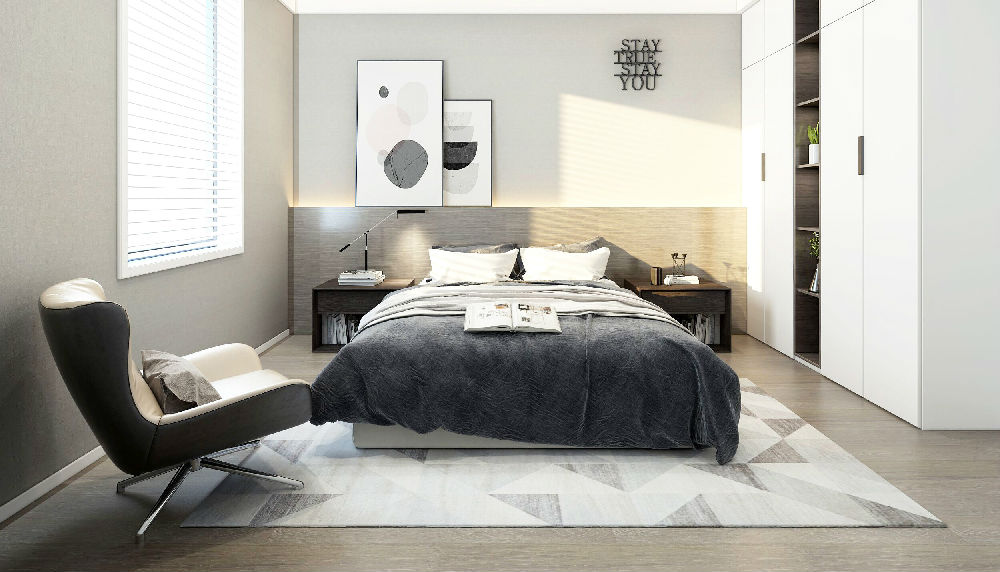 以暗色為主調的房間,配書香門地-冰巖之晨系列,與墻面顏色相呼應,但搭配金色及暖橙色更顯空間的質感和個性化,隱藏式的衣帽間讓空間布局更顯章法。