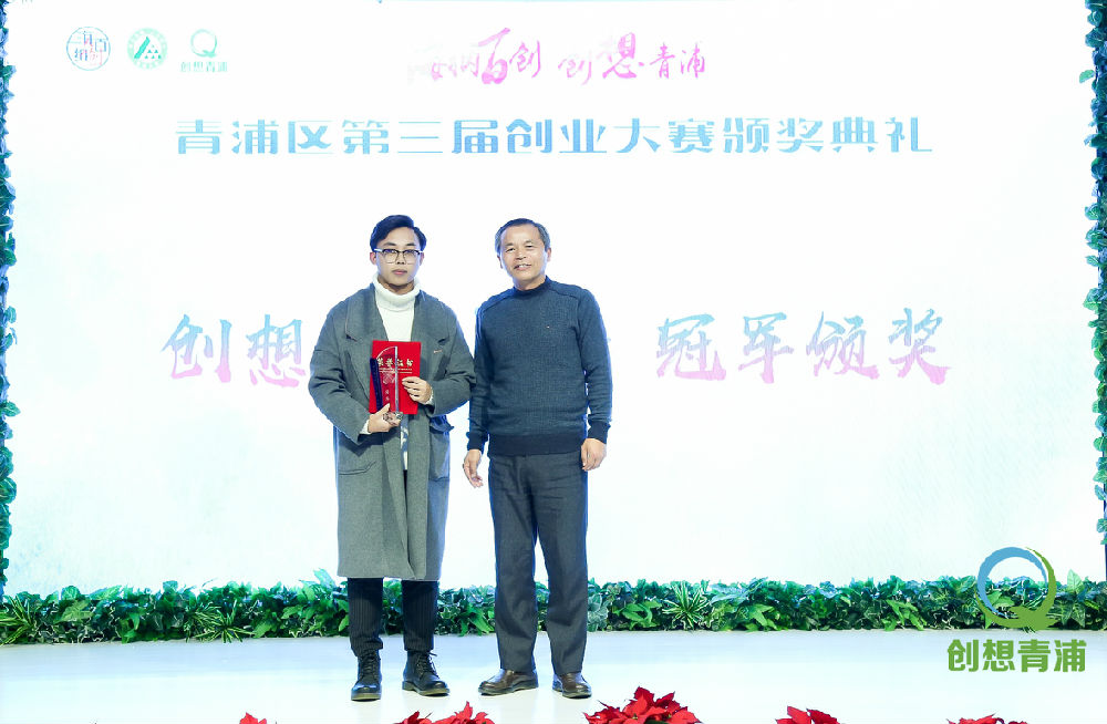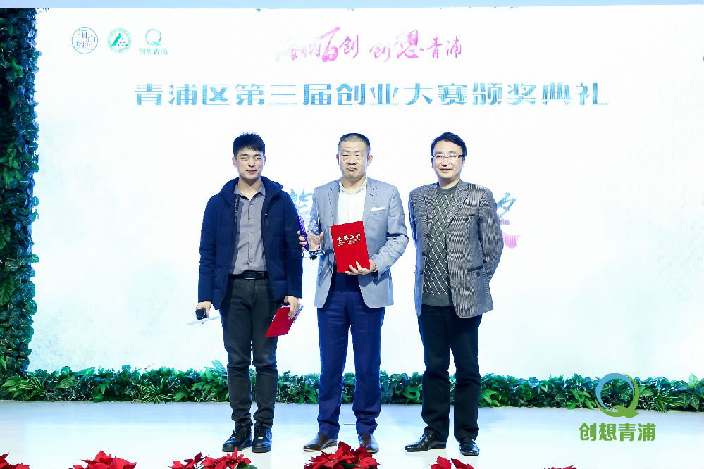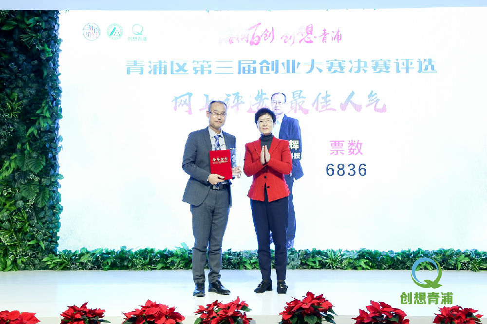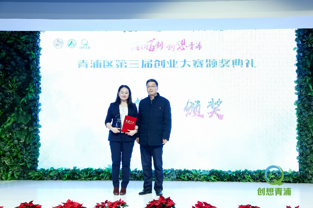 ▲上海青浦區(qū)第三屆創(chuàng)業(yè)大賽上上海市青浦區(qū)人力資源和社會保障局局長俞藕英為上海盎銳信息科技有限公司聯(lián)合創(chuàng)始人李輝頒發(fā)網(wǎng)絡(luò)人氣獎。