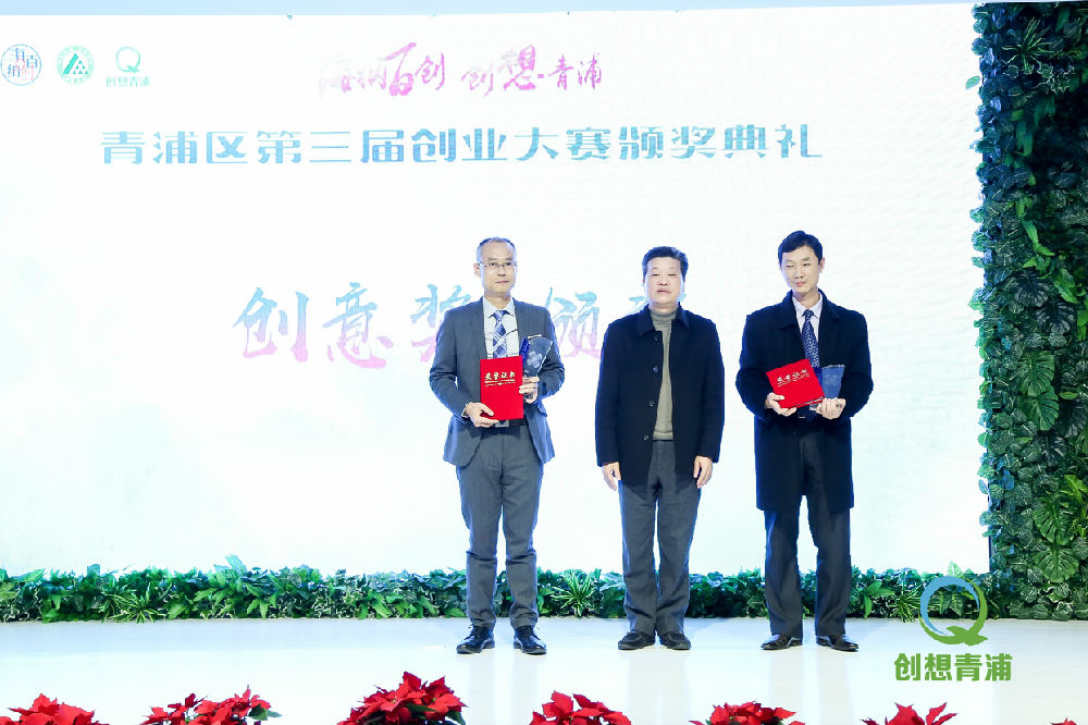 ▲上海青浦區(qū)第三屆創(chuàng)業(yè)大賽青浦區(qū)政府地區(qū)辦主任錢坤榮為獲得創(chuàng)意獎的上海盎銳信息科技有限公司聯(lián)合創(chuàng)始人李輝(左)、上海庫控實業(yè)的合伙人徐紅(右)2位選手頒獎。