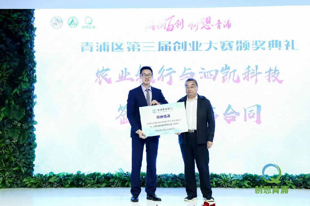 ▲農(nóng)行青浦支行行長王連軍上臺為泗凱科技胡朝斌發(fā)放創(chuàng)業(yè)貸款預(yù)授信函