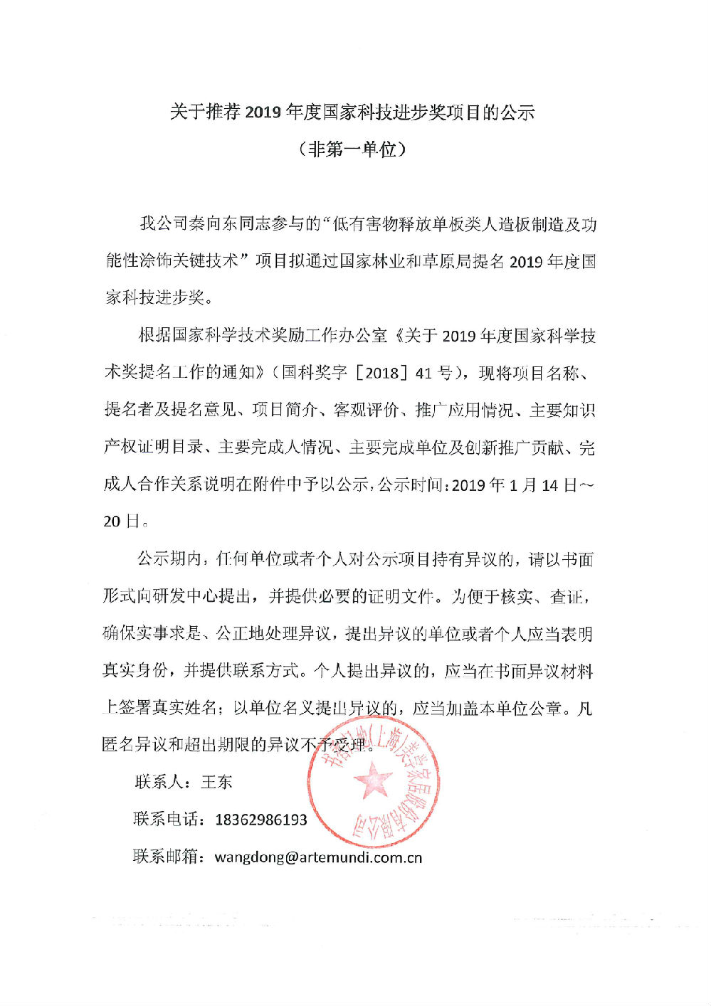 書香門地秦向東同志參與的“低有害物釋放單板類人造板制造及功能性涂飾關(guān)鍵技術(shù)”項目擬通過國家林業(yè)和草原局提名2019年度國家科技進步獎。