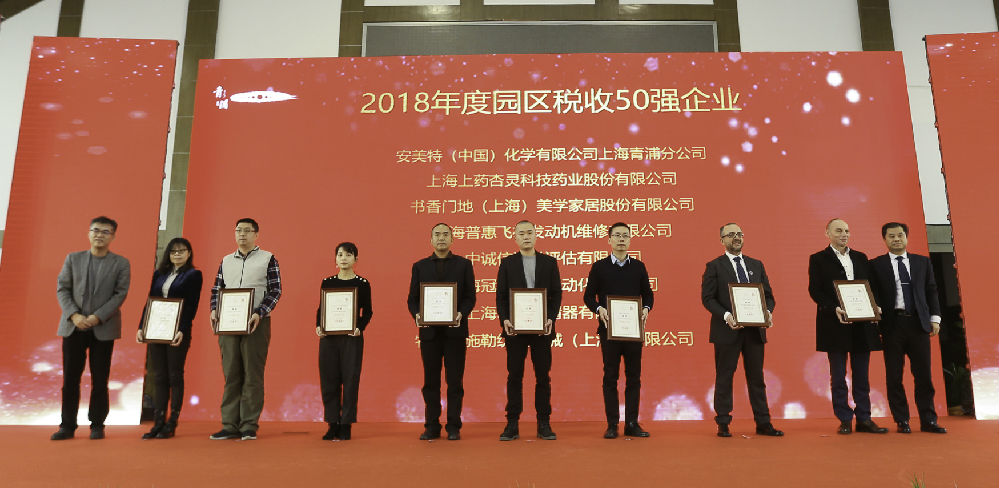 ▲書香門地斬獲“2018年度上海青浦工業園區稅收50強企業”(副總裁兼董事會秘書徐青女士(左四))
