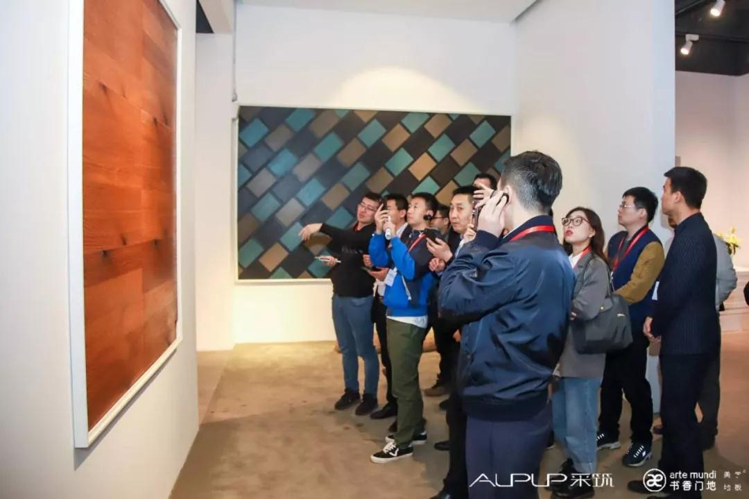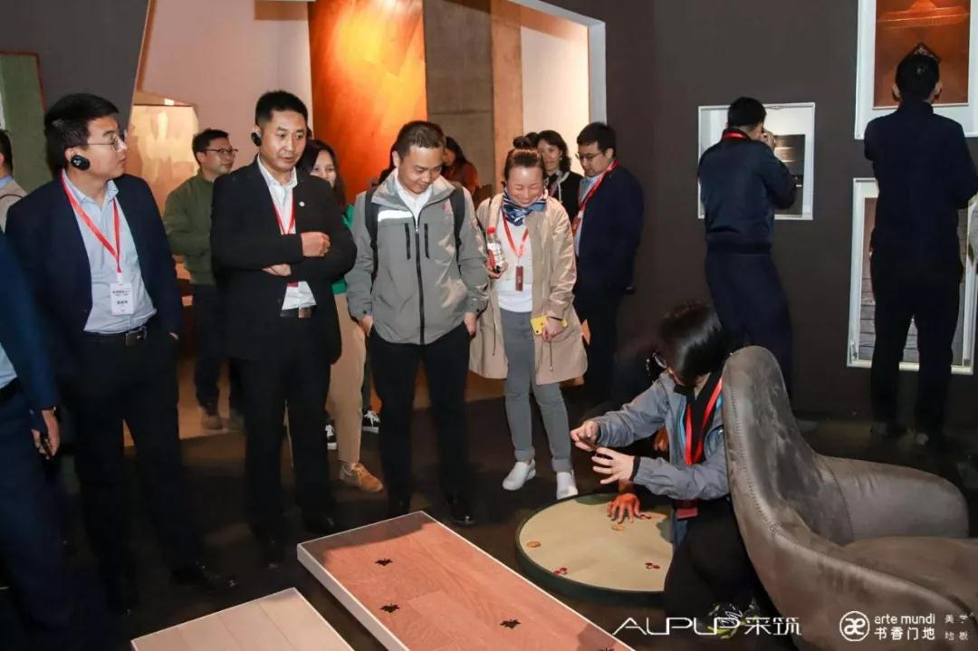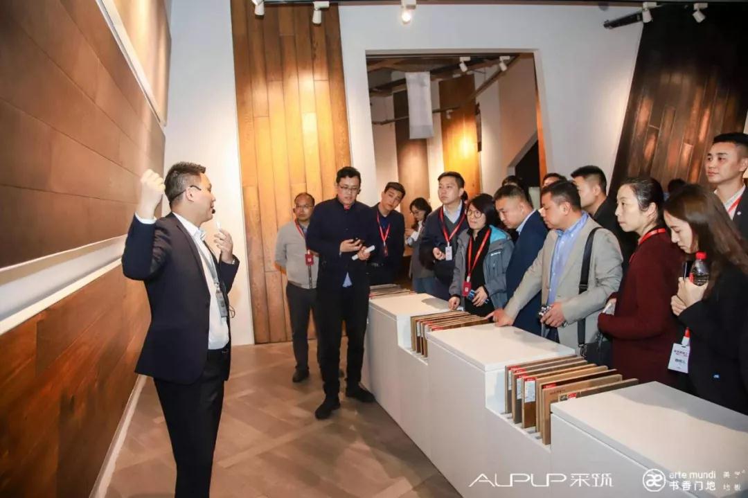 考察團參觀了上千平方的書香門地美學地板展廳,驚嘆書香門地立足藝術的產品創作態度,也被多款國內外高端工程精裝項目的定制地板所吸引??疾靾F駐足聆聽講解人員描述美學地板的創作靈感、制造工藝,觸摸每一款地板感受表面肌理的變化,體會富有創意的人工擦色帶來的視覺享受。在眾多地板系列中,考察團對電影《小時代3》的定制拼花地板ART021、上海養云安縵酒店的定制地板“染凈”系列,以及明星們熱捧的YUPPIE紳士系列、造物者系列、施華洛世奇水晶元素元素、花藝、銅藝、彩貝、琺瑯、皮革等跨界元素地板產品紛紛點贊,無不為這個美學地板“藝術博物館”里的地板藝術作品所折服。
